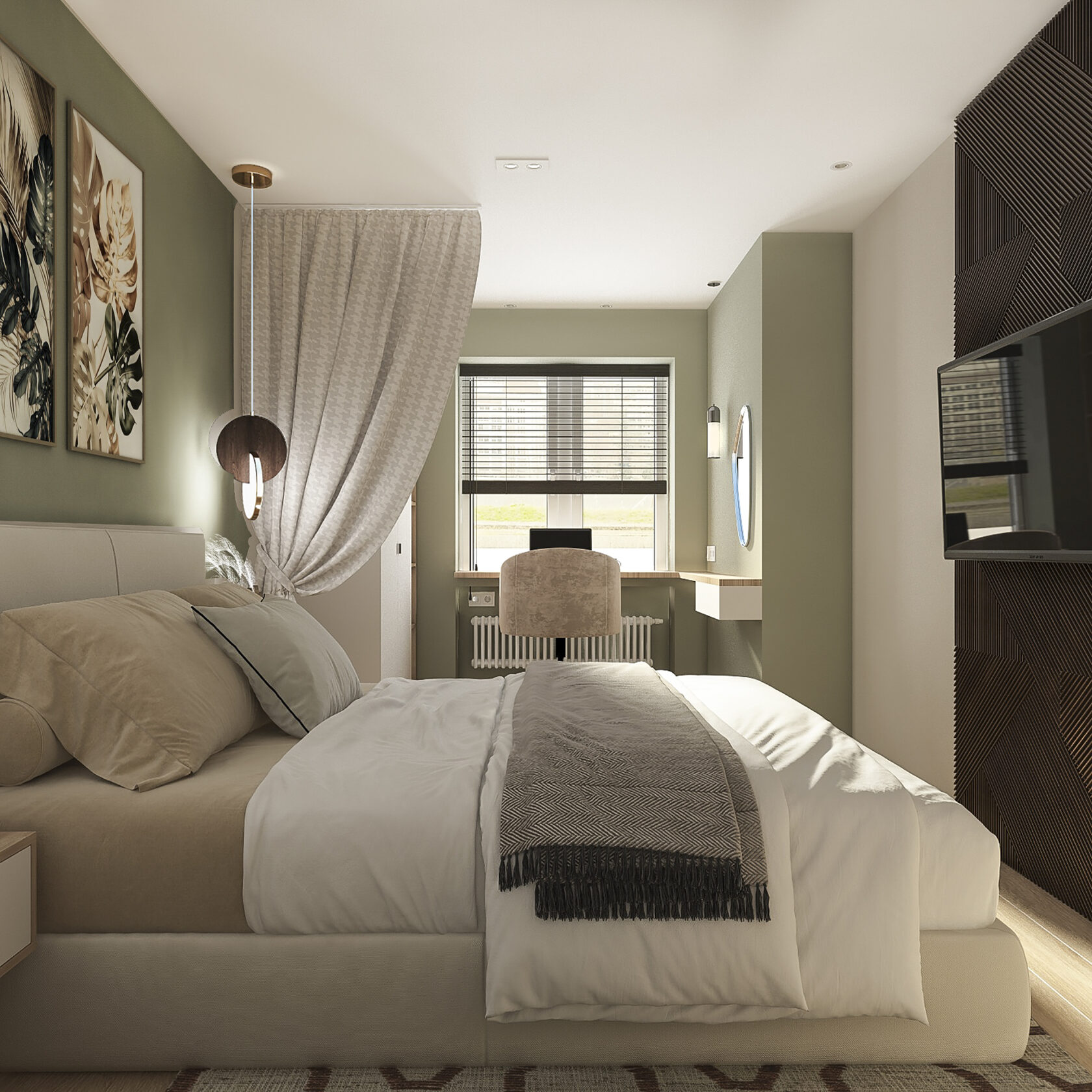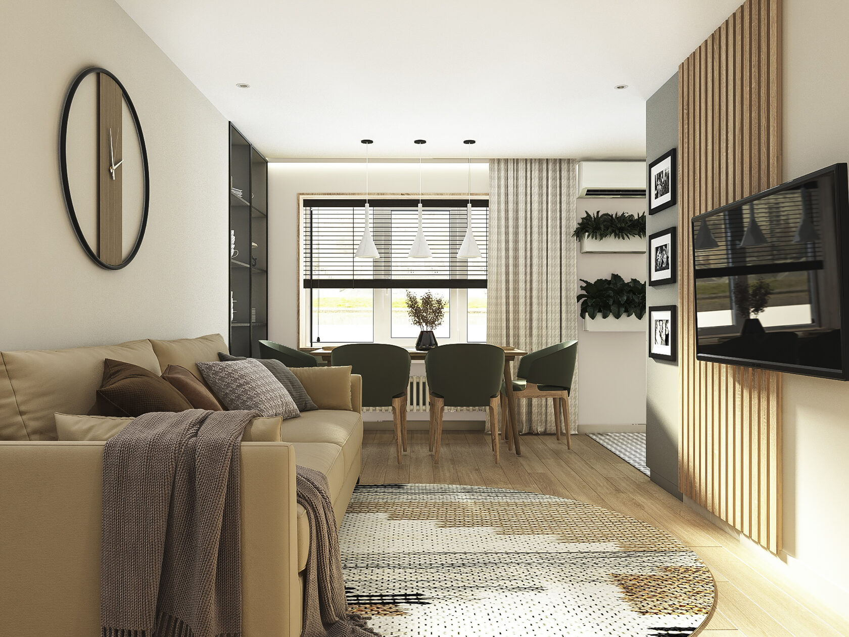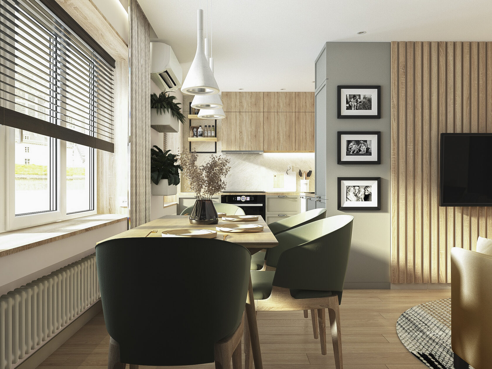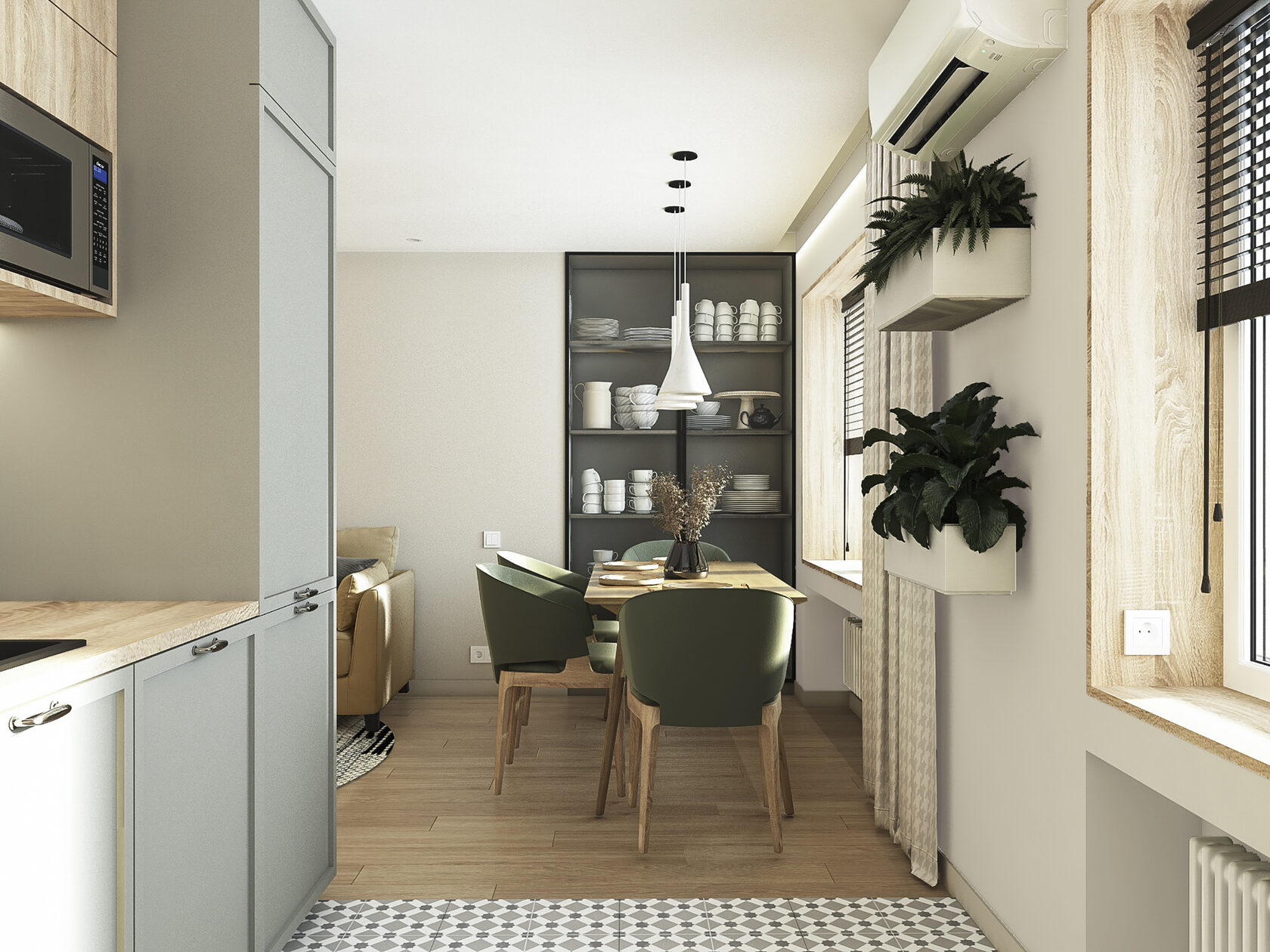 Много дерева, в том числе натурального в отделке окон, камень с природным рисунком и присутствием ярких но уютных цветов