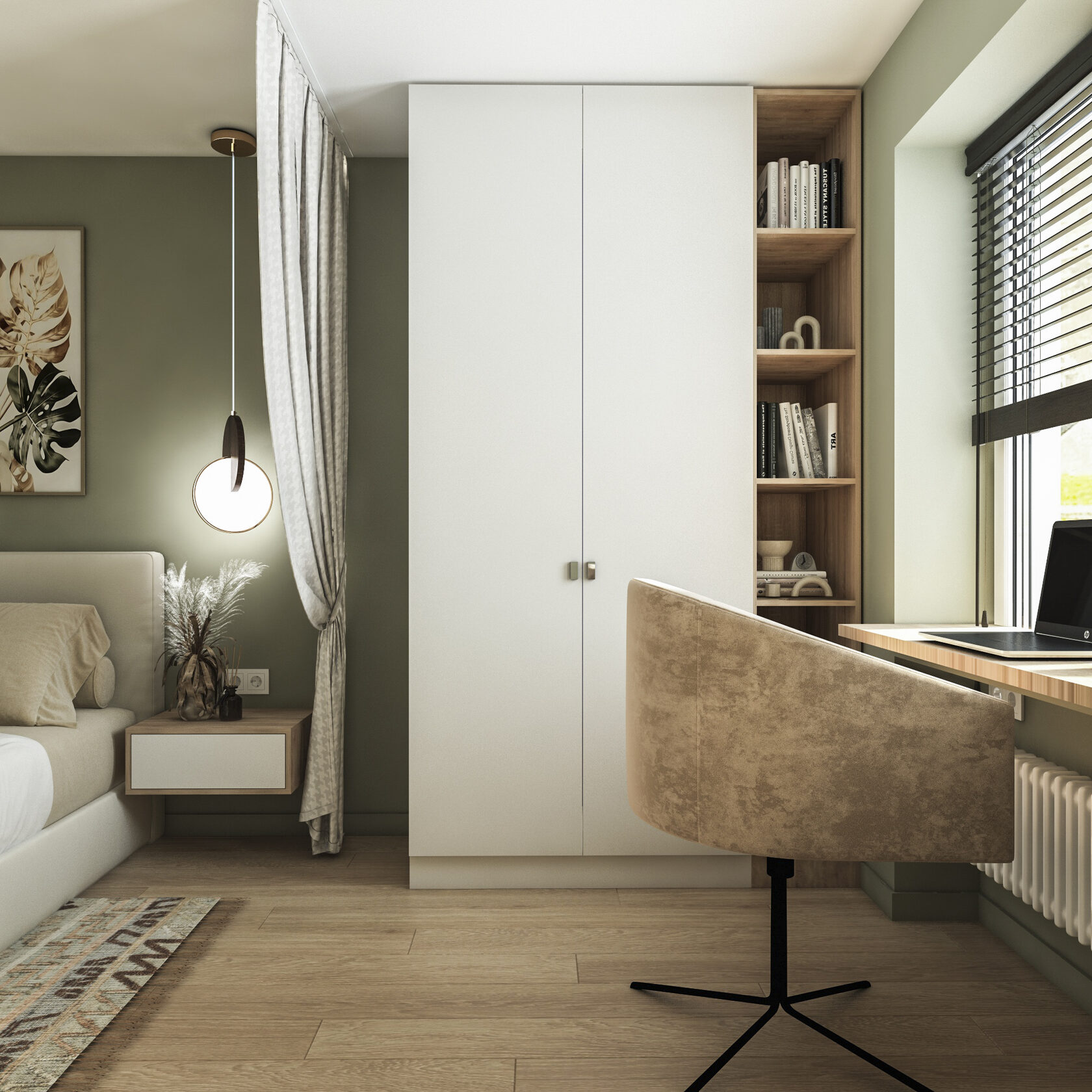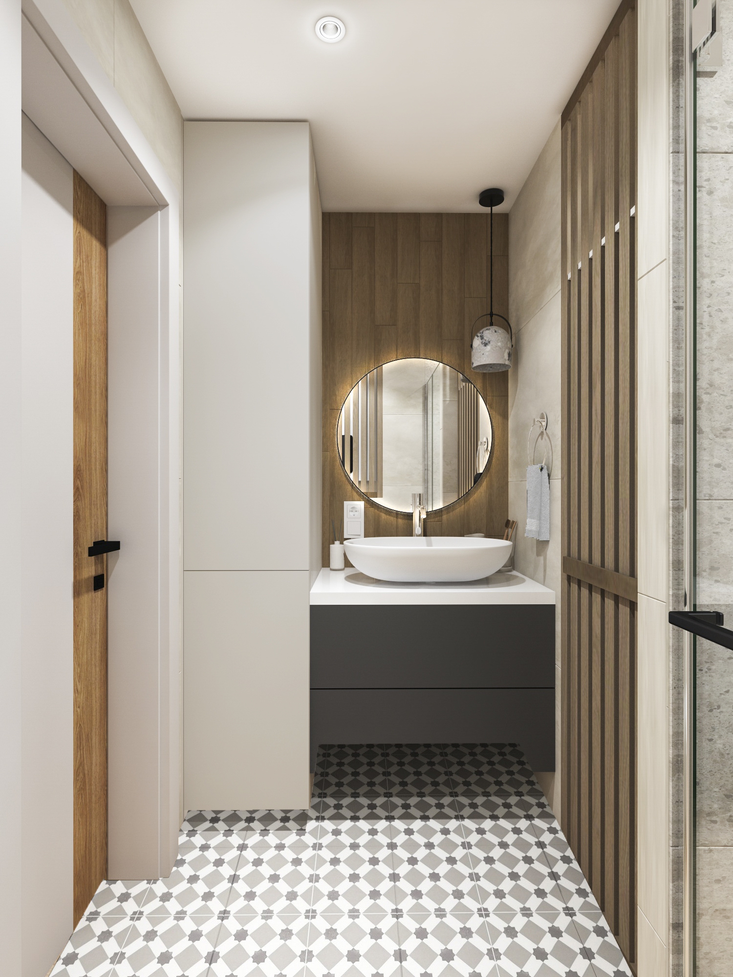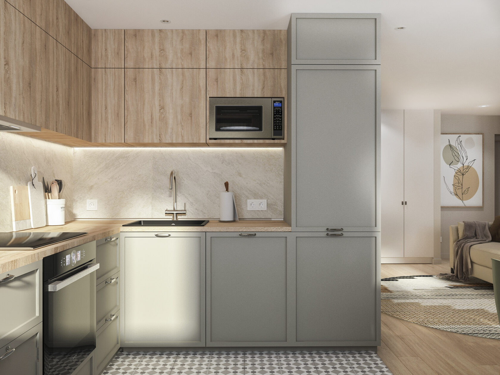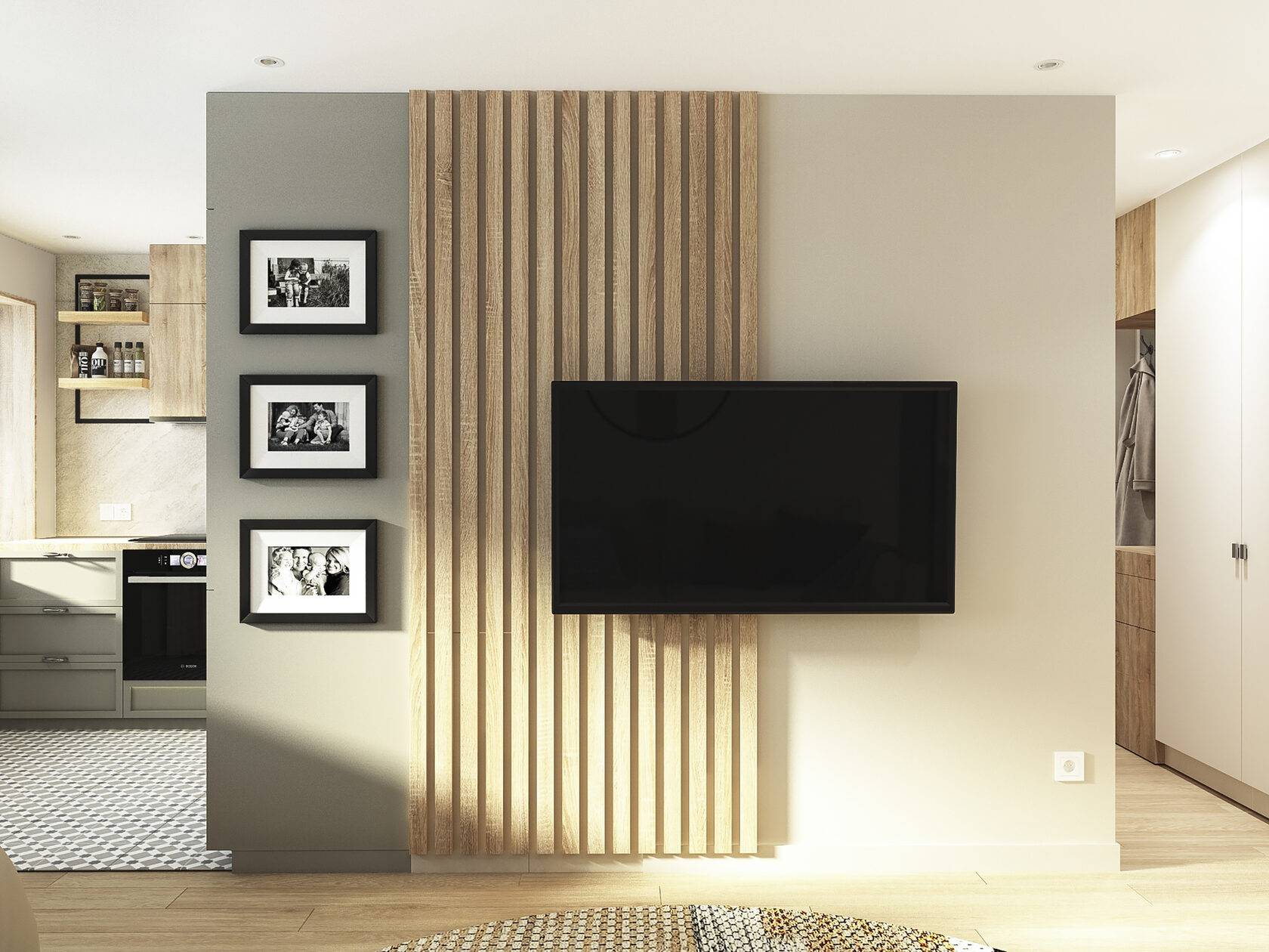 Много дерева, в том числе натурального в отделке окон, камень с природным рисунком и присутствием ярких но уютных цветов