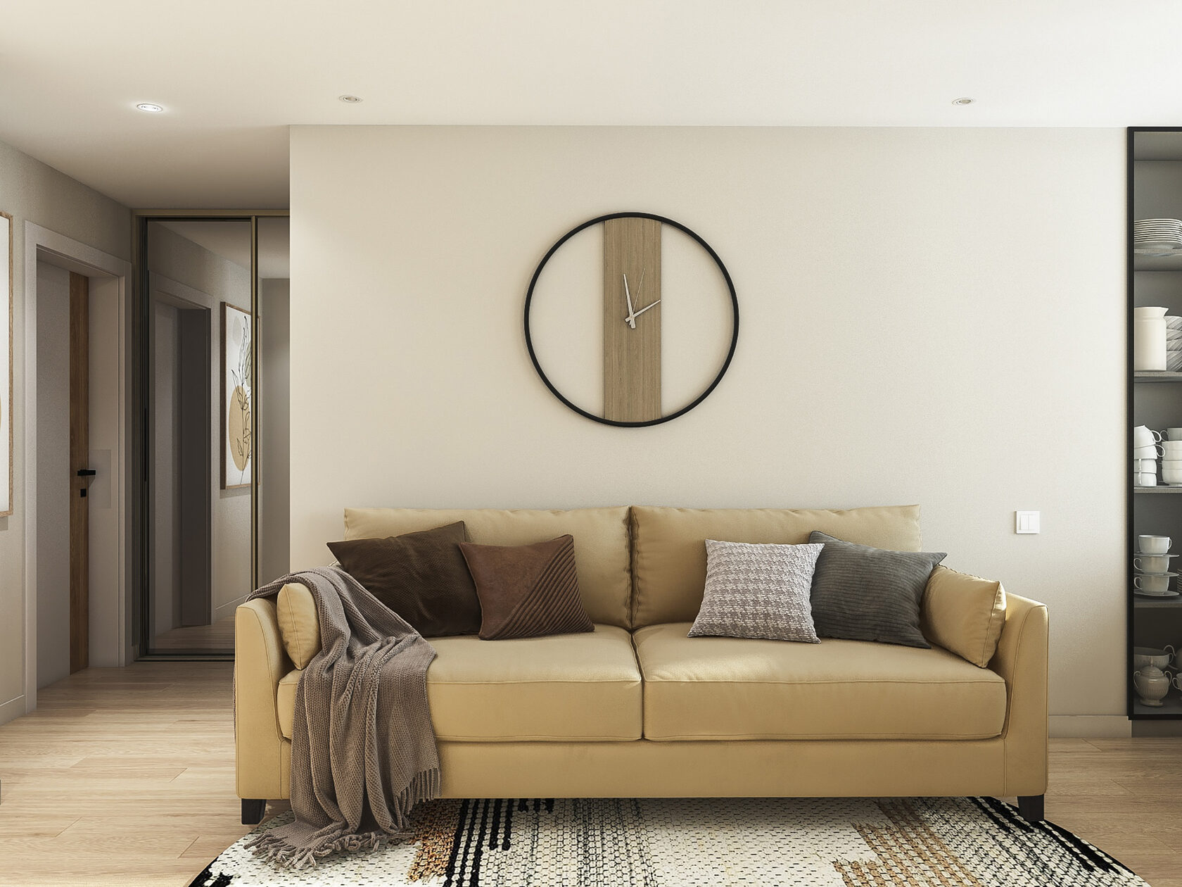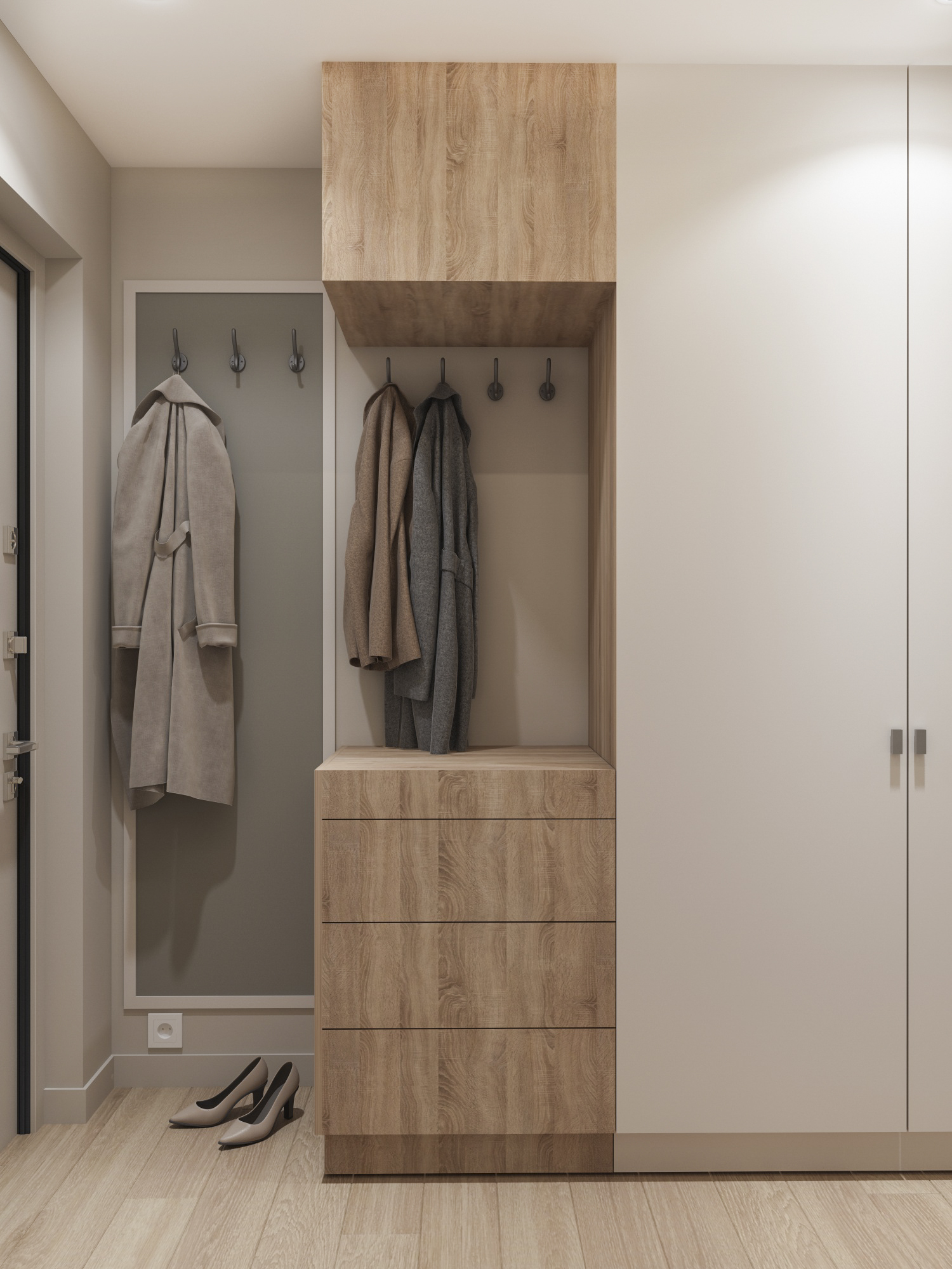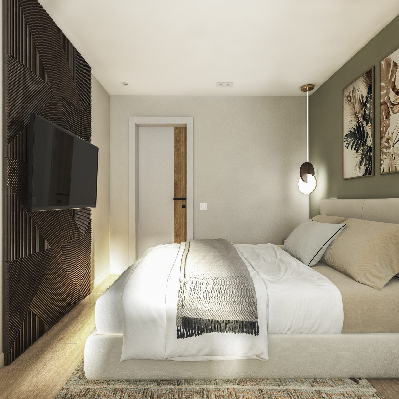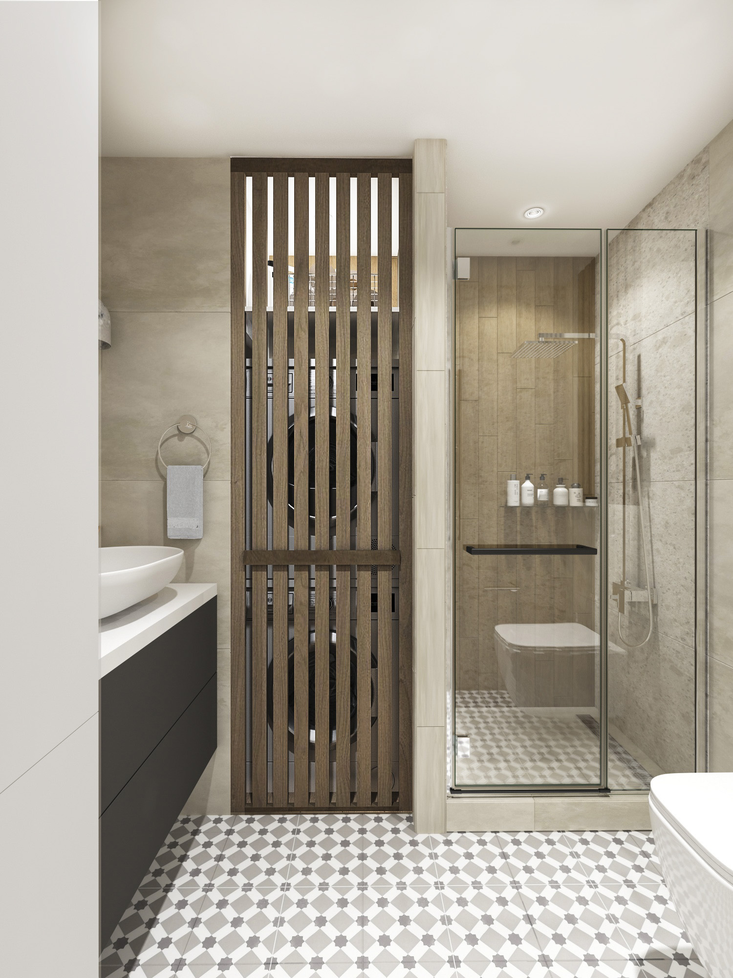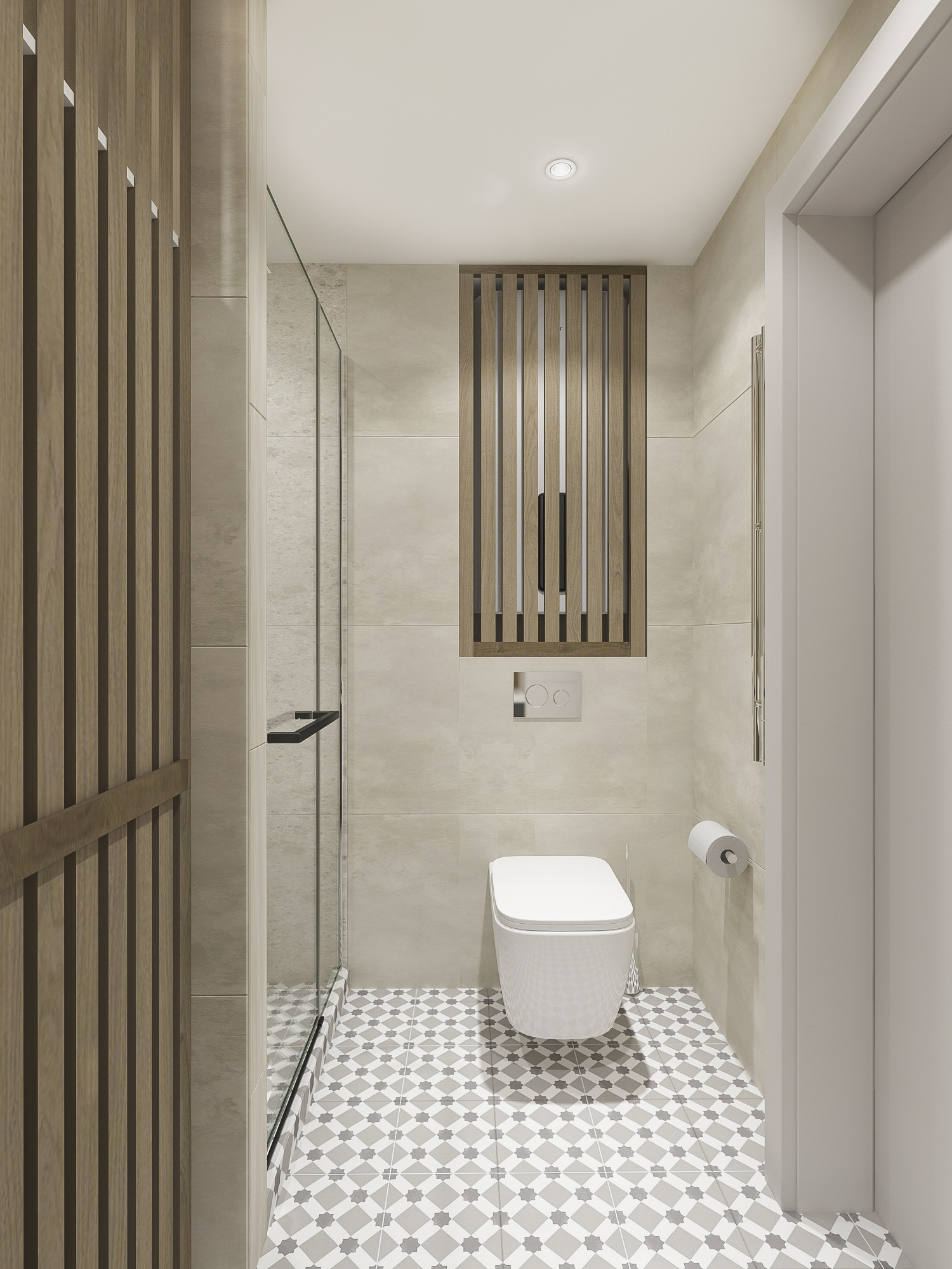 Много дерева, в том числе натурального в отделке окон, камень с природным рисунком и присутствием ярких но уютных цветов