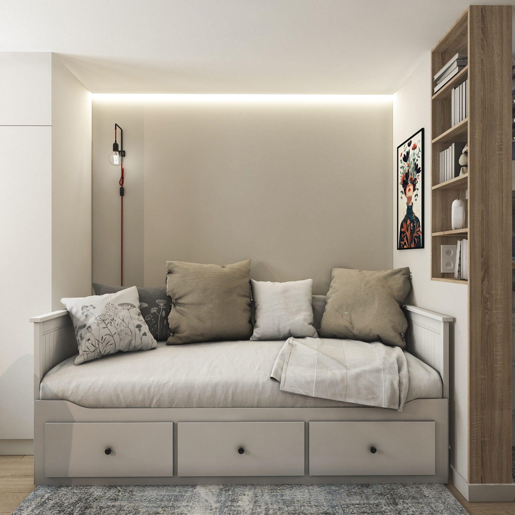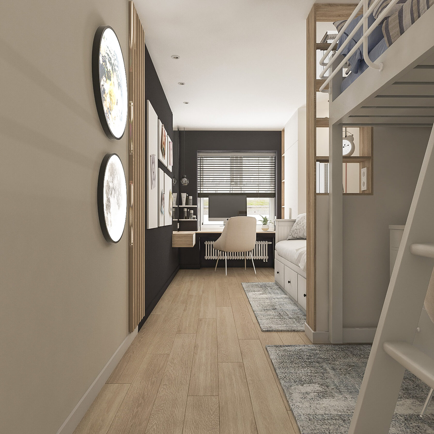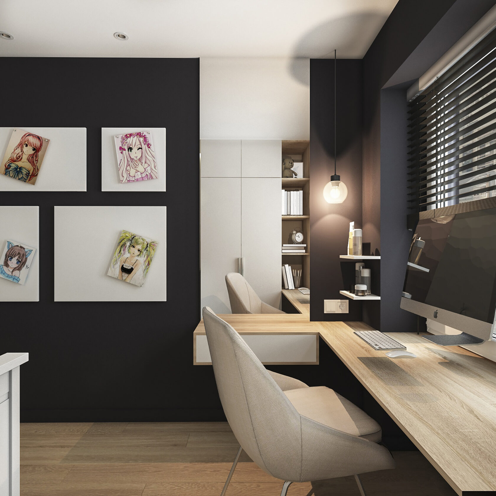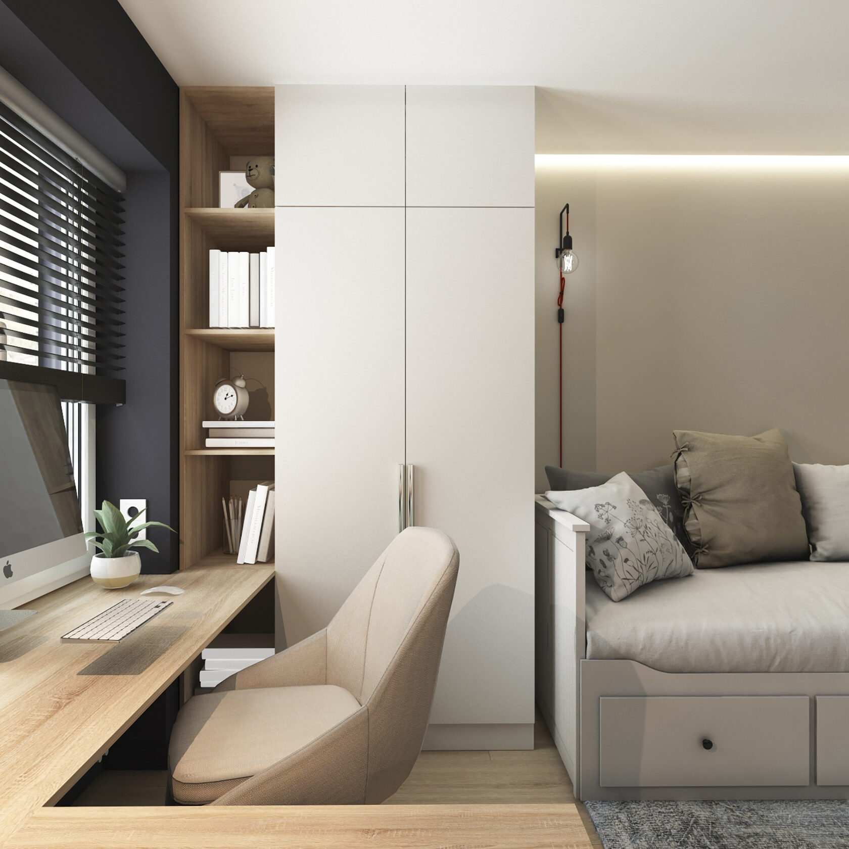 Много дерева, в том числе натурального в отделке окон, камень с природным рисунком и присутствием ярких но уютных цветов