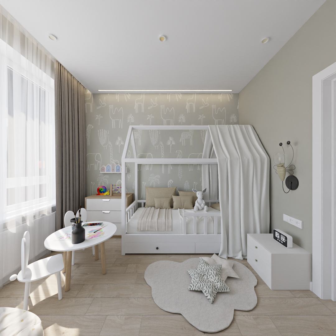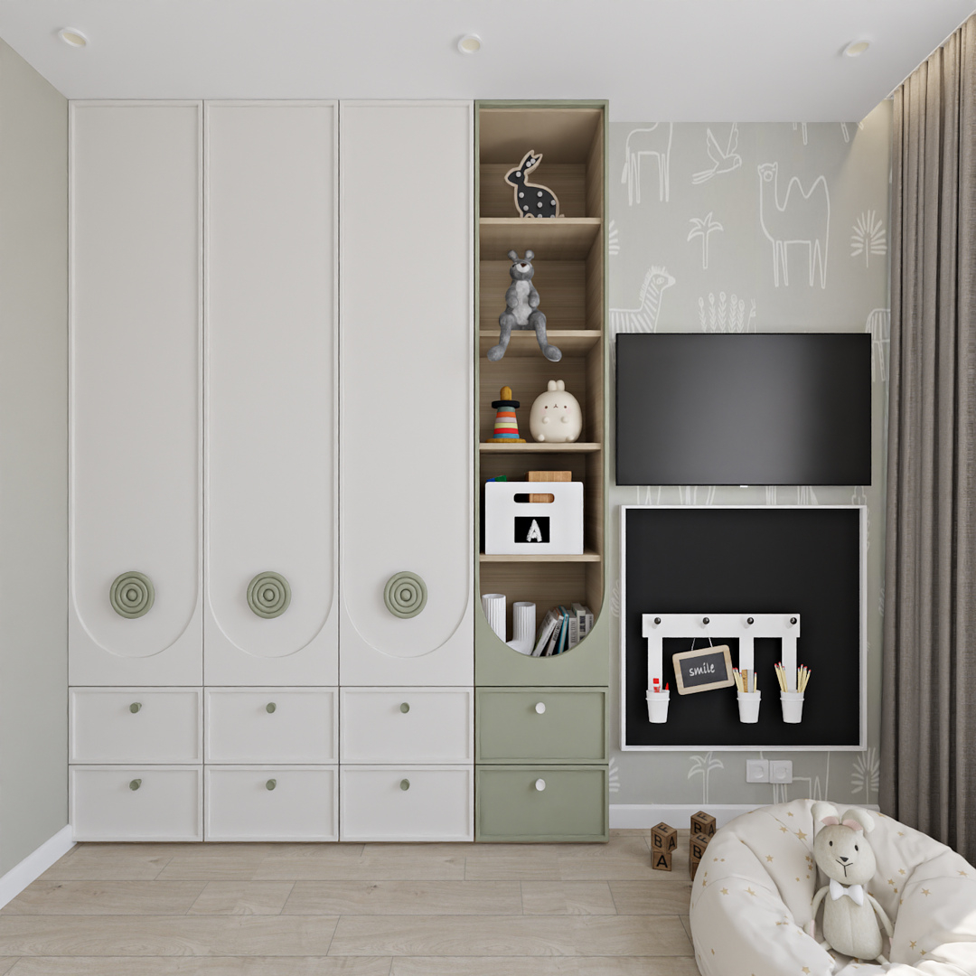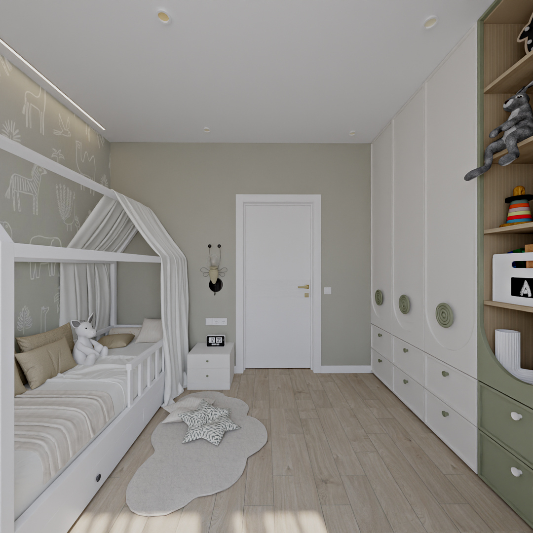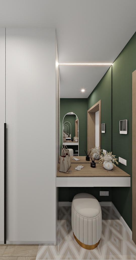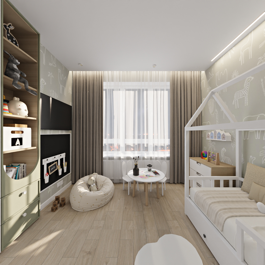 Баланс между очень ярким зеленым с добавлением золотой фурнитуры и спокойной нейтральной детской