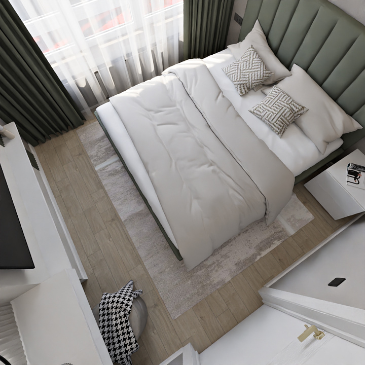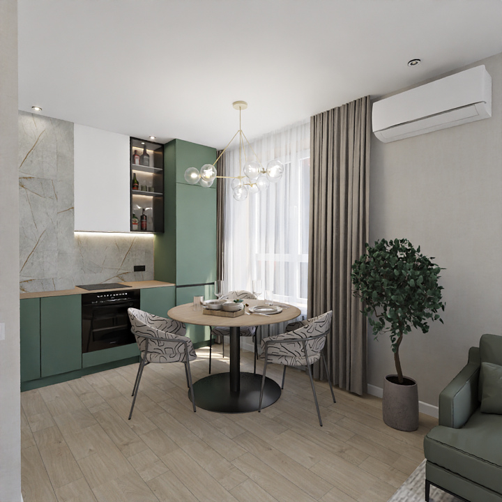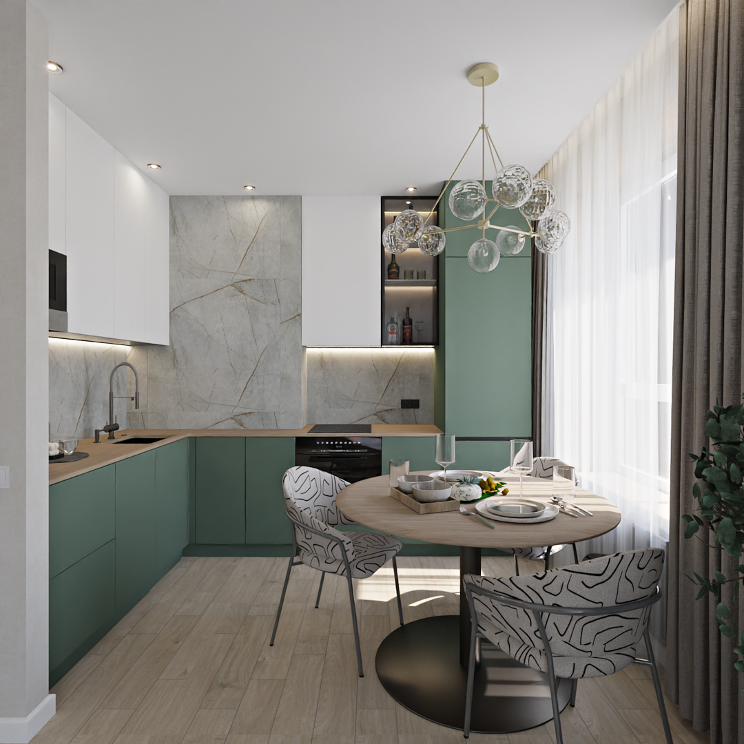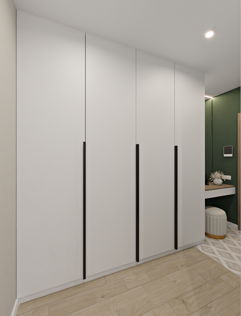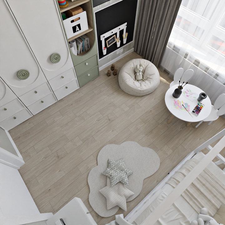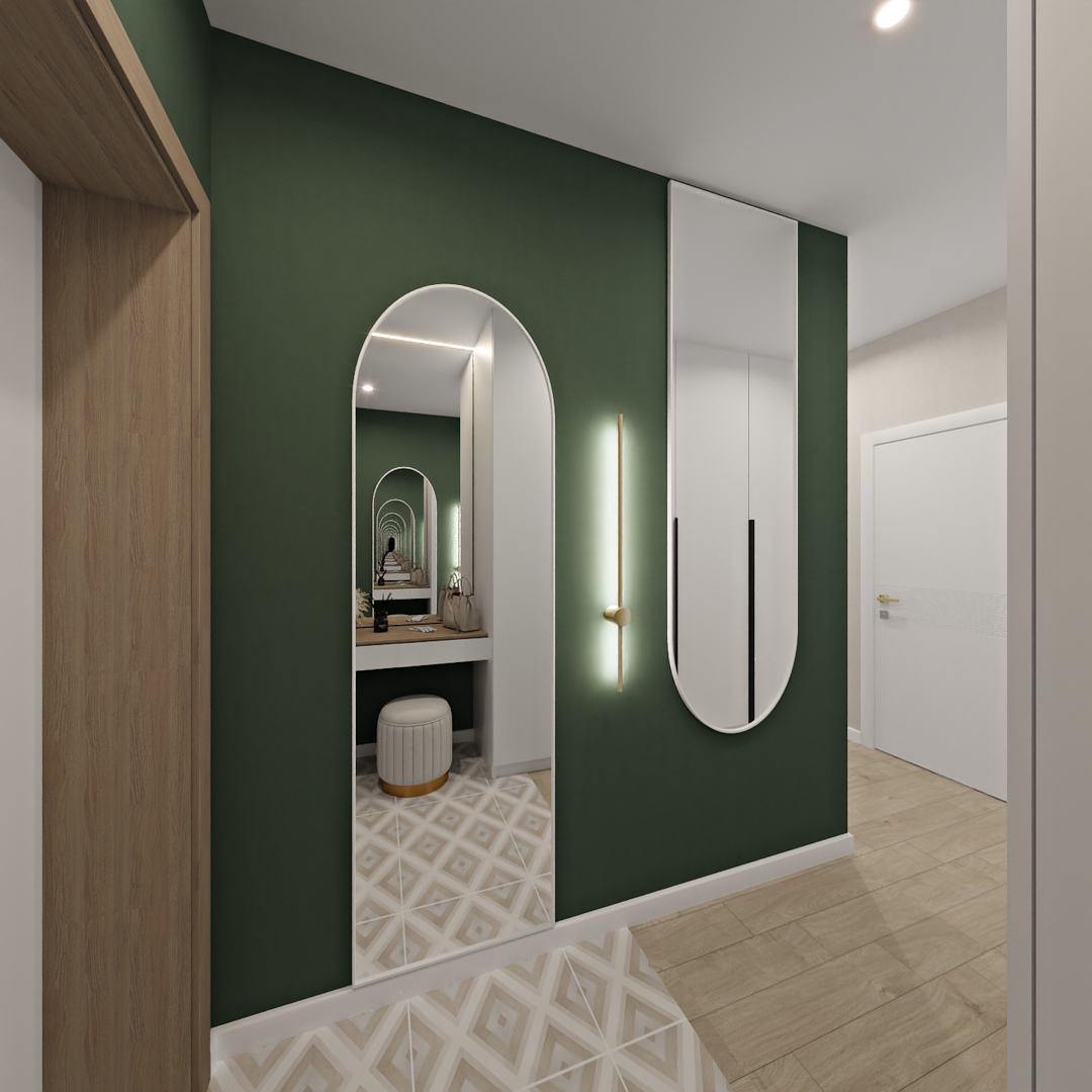 Баланс между очень ярким зеленым с добавлением золотой фурнитуры и спокойной нейтральной детской
