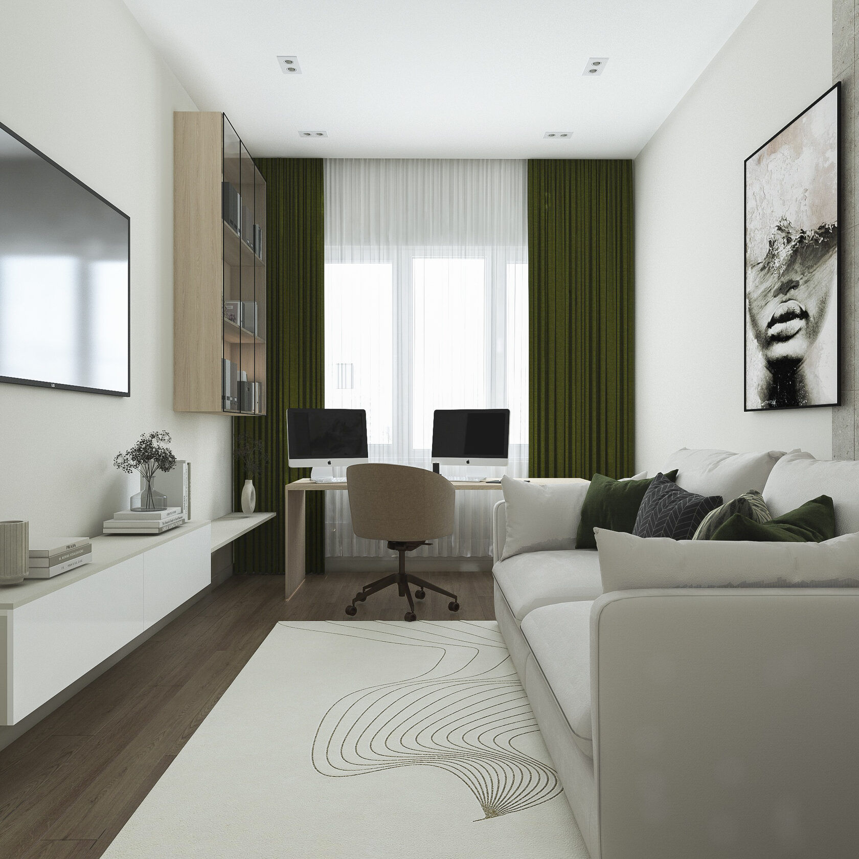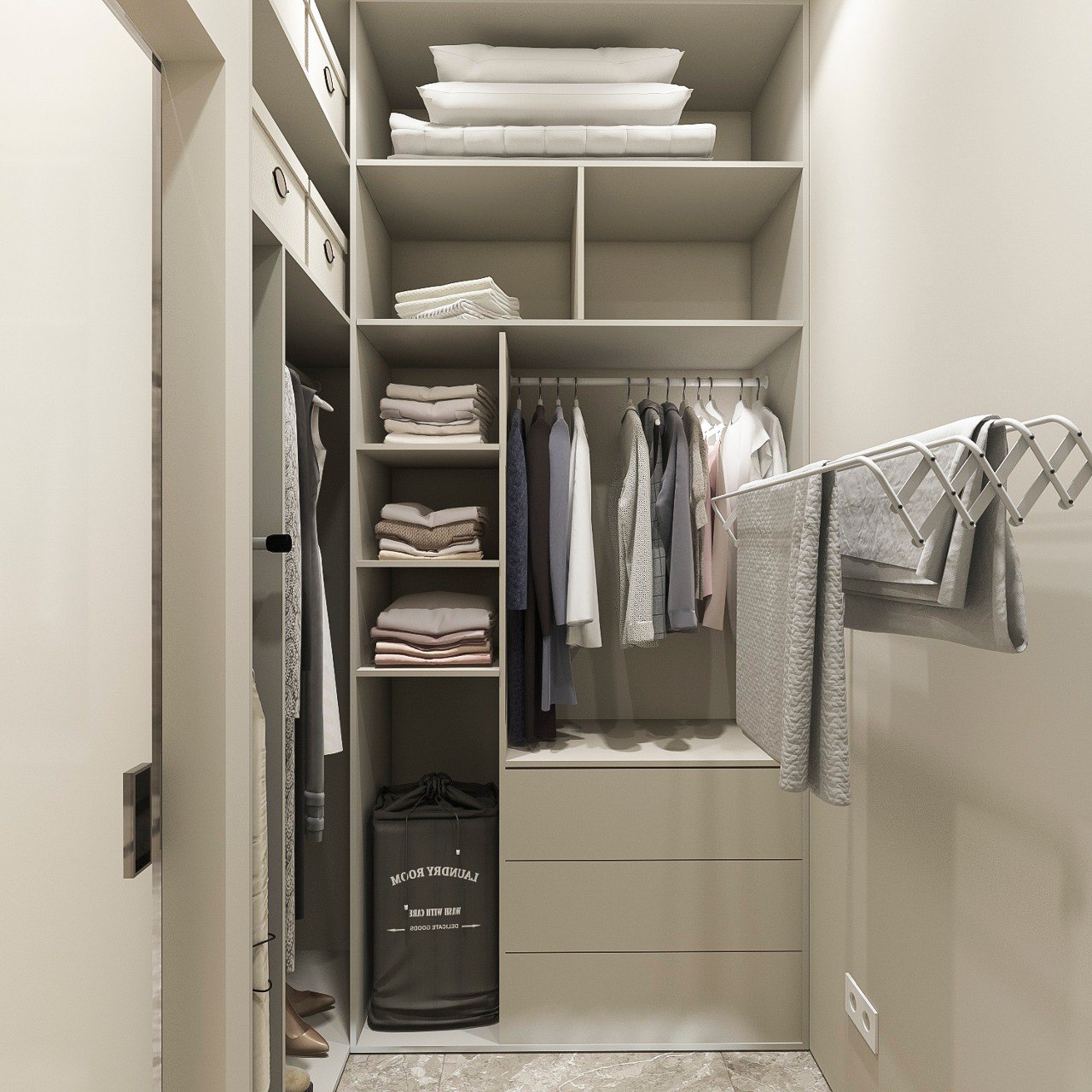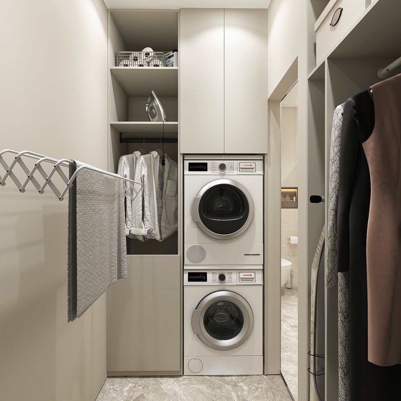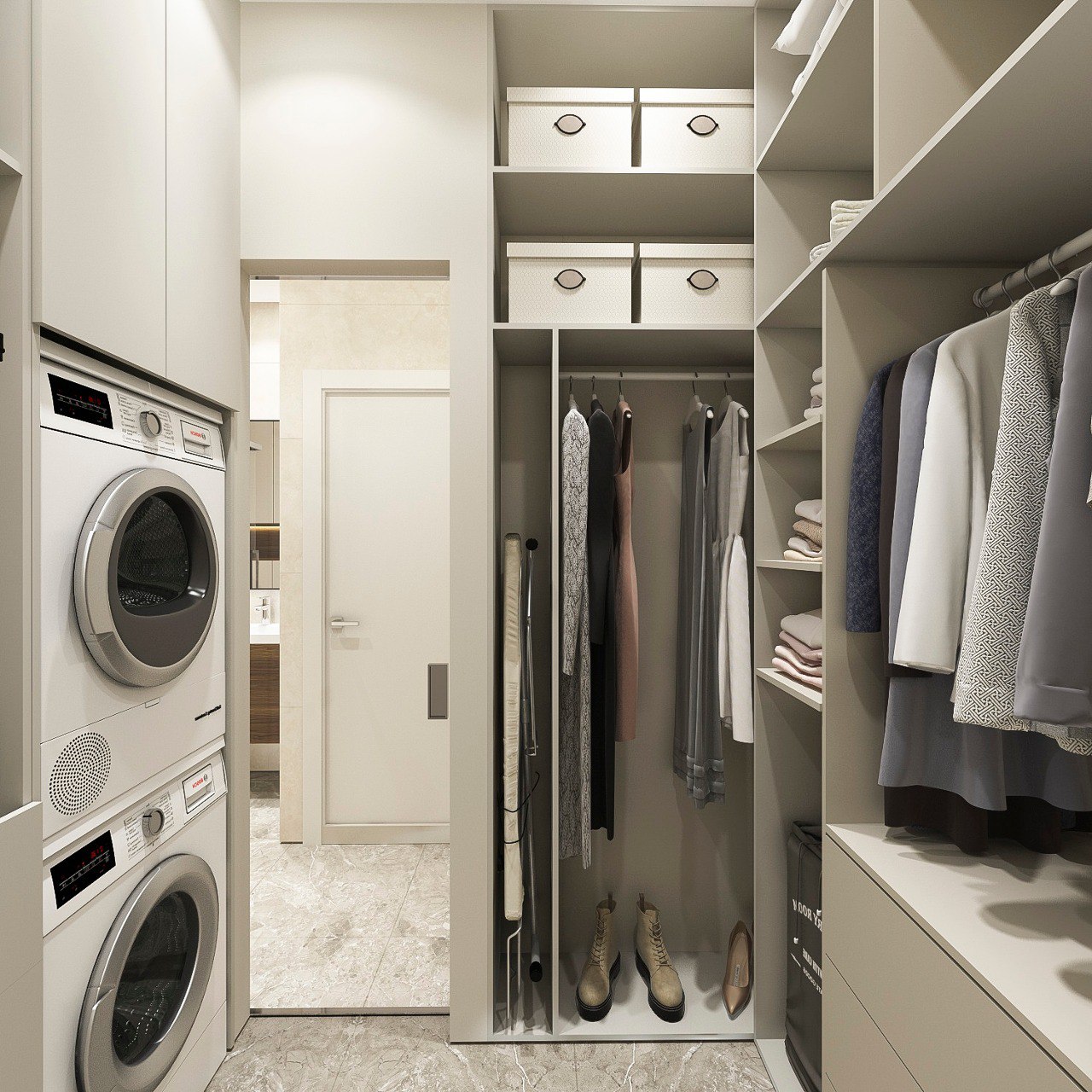 Выделенный кабинет, зона постирочной и зона хранения, светлая спальня